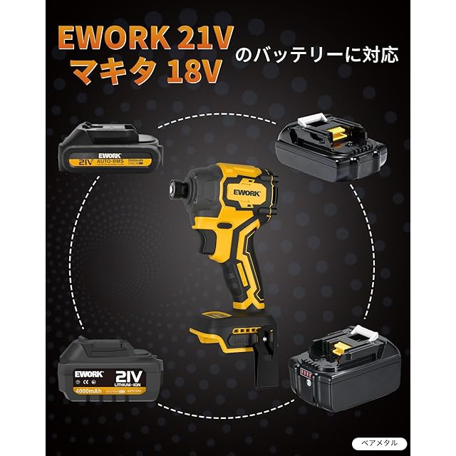 ✅[対応マキタバッテリー]EWORK 18Vインパクトドライバーは、マキタの18VバッテリーおよびEWORK 21Vシリーズバッテリーと互換性があります、この商品には本体とドリルビット29本セットのみが含まれますそして、蓄電池・充電器別売