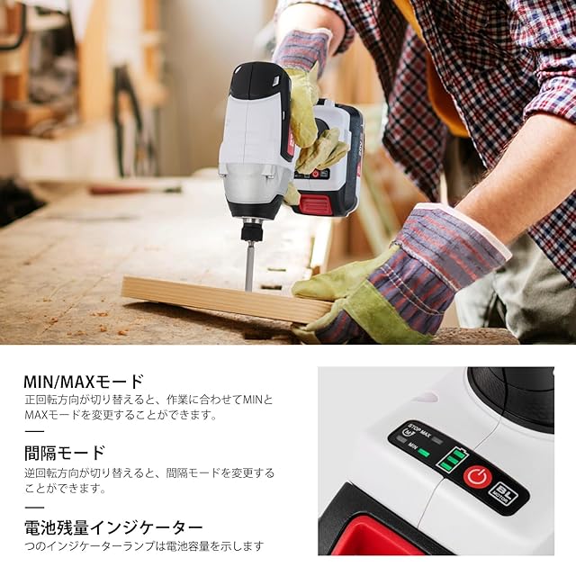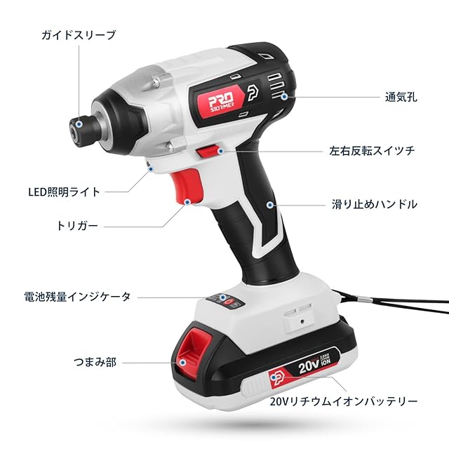 無段変速&正逆転切替機能:Prostormerインパクトドライバーは無段変速機能が搭載され、トリガーの引き加減によってスピード調節が可能です。無負荷回転数は最大2000RPMまでを調節できます。また、横の出っ張りの部分を押して「正転」「逆転」の切替を行うことで、ビットの回転方向を切り替えできます