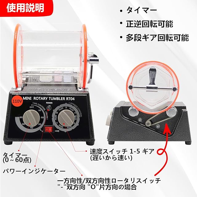 【多機能】ポリッシャーの操作パネルで、一番左のノブスイッチは、60分に設定できるタイマーです、手動での監視が不要。真ん中の赤いボタンはワンウェイ/ツーウェイのロータリースイッチで、「_」がツーウェイ、「O」がワンウェイで、ドラムを時計回り、反時計回りに回転させることができる。右端のつまみは、スピードの調整に使用します。 調整範囲は1~5段階です。 必要に応じて適切な走行時間や速度を簡単に設定することができます。