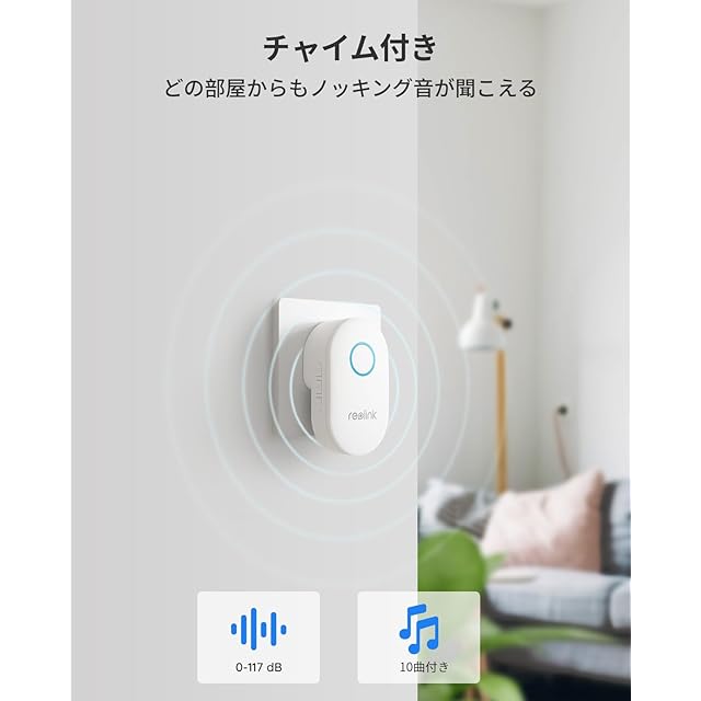 チャイムが付属しています!Chimeをどの部屋の電気ソケットにでも差し込んで、訪問者が「ノック」したときに確実にお知らせを受けることができます。10種類のメロディーから1つを選び、音量も調節することができます。