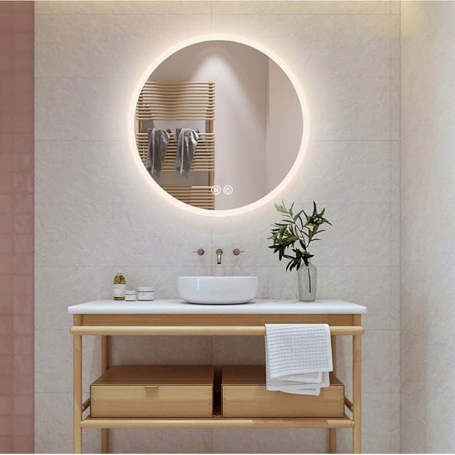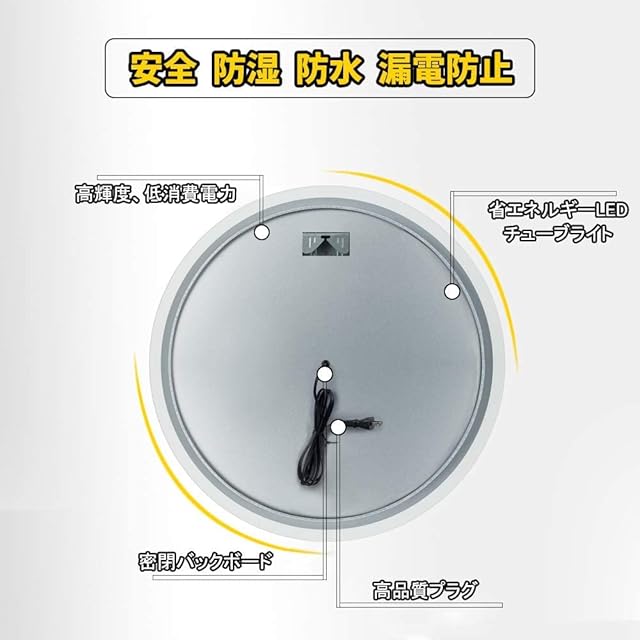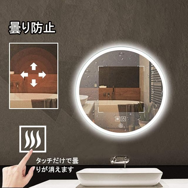 ミルオ君の鏡工房 LED浴室ミラー ウォールミラー 化粧鏡 壁掛け 照明付き ドレッサー 洗面所 洗面台 省エネ 明るさ調整 曇り防止機能 照明付き 防水加工 飛散防止 丸型 60×60cm ふちLED