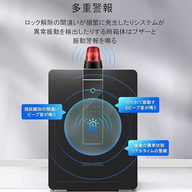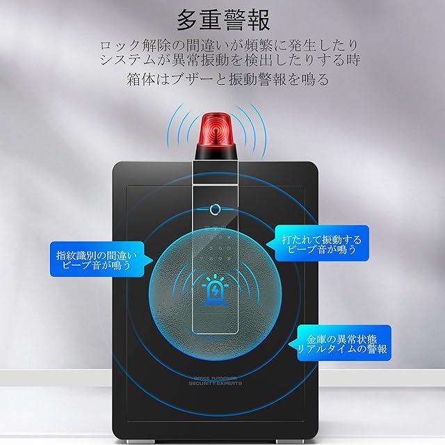 【頑丈な五重セキュリティ保護】 (1)硬鋼材料、破壊防止の高硬度の素材を採用し、破壊や切断されることを防き、お客様の貴重品は大切に保管できます。 (2)ハンドルノブには最新の技術を採用し、乱暴な開錠を防止し、安心してご使用できます。 (3)こじ開けを防ぐための合金鋼強化ドーア、防犯性もアップさせます。 (4)金庫は超長い楕円形のロックボルトを備えており、全鋼製の防犯強化されたロックボルトは、扉内にしっかりと嵌まり、多次元の撬り防止を実現します。(5)金庫が激しく揺れたり、パスワード入力が5回間違ったりすると、セキュリティアラームが1分間トリガーされます。