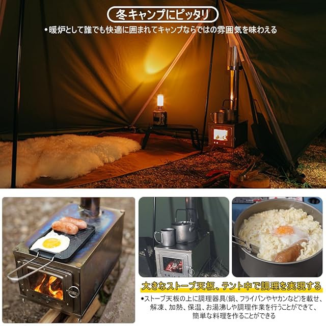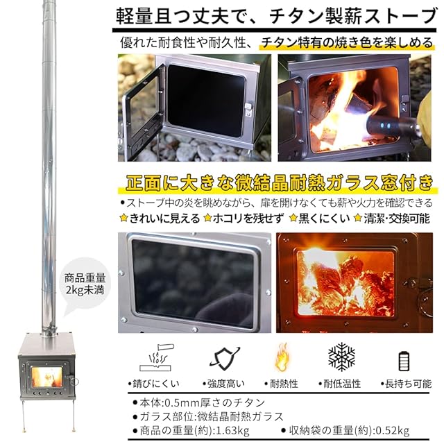 材質:本体はチタンを採用、特徴が軽量且つ丈夫で、そして、耐食性や耐久性に優れていて、錆びることなく、耐熱性及び耐低温特性に優れております。また、火にかけて、チタン独特の焼き色を楽しめることができます。窓は微結晶耐熱ガラスを採用、熱に強く、何時までもきれいに見え、ホコリを残せず、黒くなることなく、安全性を確保しつつ、ストーブ中の薪や火力を確認することもでき、扉を開けなくても火の管理や調節を手軽に行うことができます。