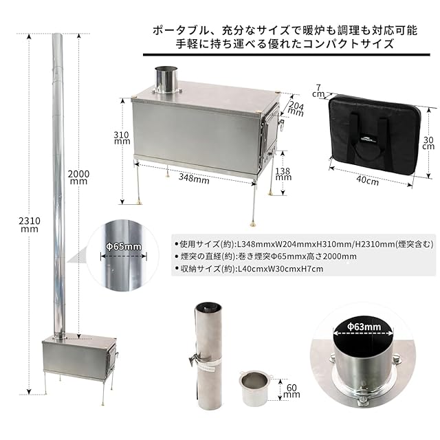 サイズ:使用時は(約)L348mmxW204mmxH310mm/H2310mm(煙突含む)、巻き煙突Φ65mmx高さ2000mm、収納時は(約)L40cmxW30cmxH7cmなコンパクトサイズに折り畳めて、持ち運び楽々。