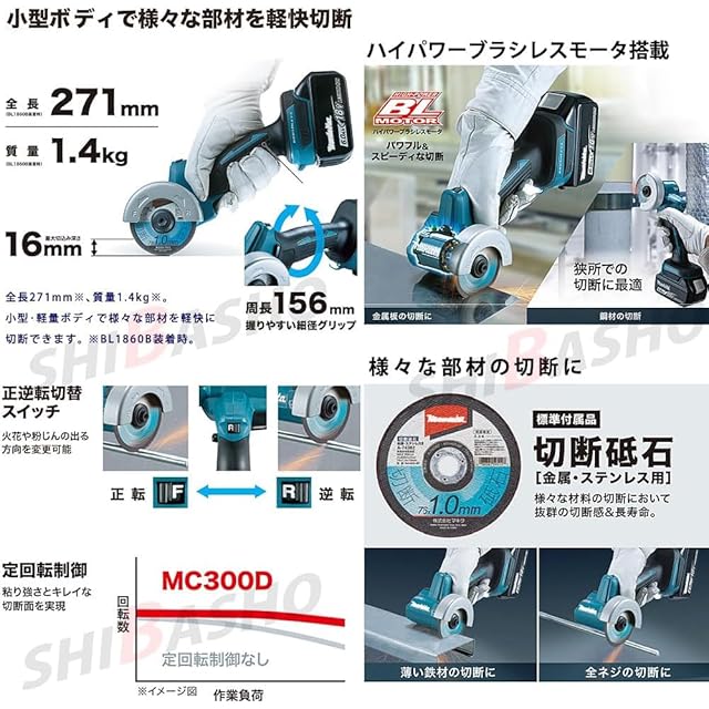 SHIBASHOでは、【MC300DZ】本体に、金属・ステンレス用切断砥石 (10枚入)【A-74382】をセットにしました。様々な部材の切断に 薄い鉄材、全ネジ等に。抜群の切断感&長寿命な切断砥石です。