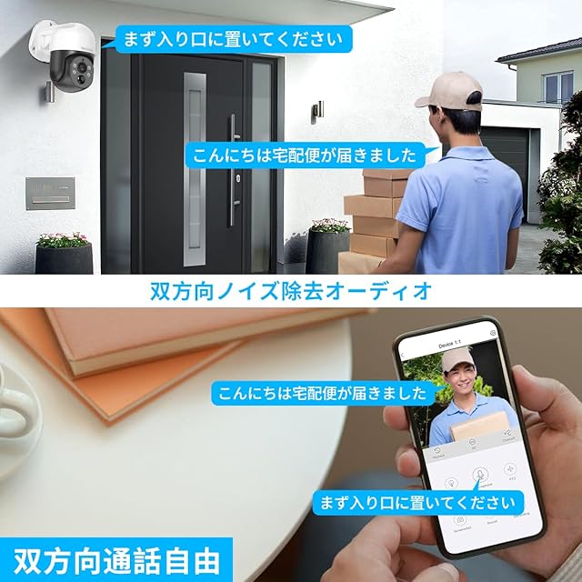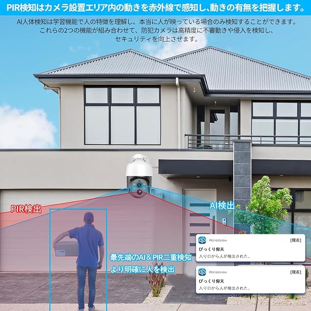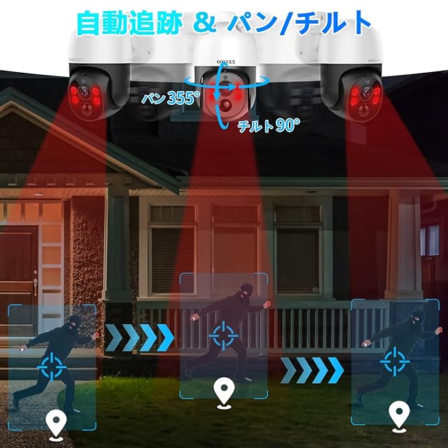 {PTZコントロール・可帰位自動追跡} 水平355°/垂直90°回転機能が搭載され、いつでもスマホからレンズの向きを好きな角度に調整し、戸建の車庫と入り口が360°全方位見渡せて、死角なしでの監視が可能です。自動追尾機能が付き、人を検知するとすぐに自動的に追跡し、重要な瞬間を逃さず全部記録します。