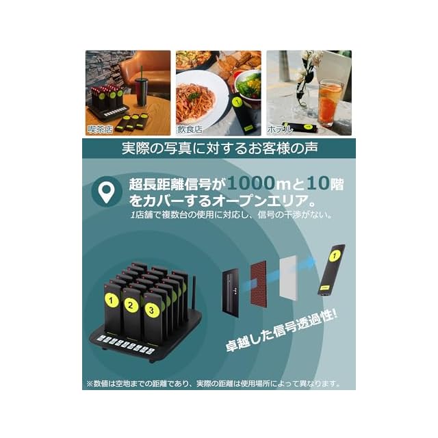 【長距離、安定した信号】業務用呼び出しベル 通信の干渉を回避、強力な信号を備えた10の壁を貫通し、受信範囲は約1000mの空き領域作動距離です。(実用の使用環境により異なります)