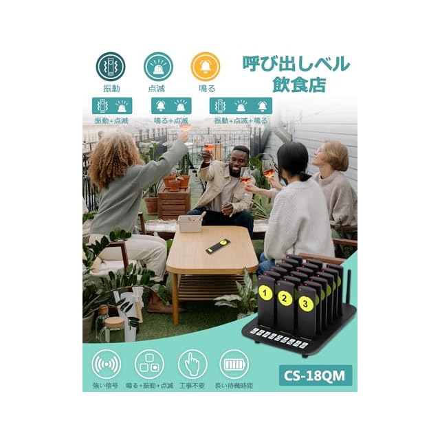 【呼び出しチャイムの機能】3種類の通知モード:1:閃光+鳴る、 2:振動+閃光、3:振動+閃光+鳴る(初期値)。受信音量は調節可能(0-110dB)。通知回数は調節可能:1~18回(3~54秒)。「STOP」ボタンを押すと、ビープ音とジッタをキャンセルできます。