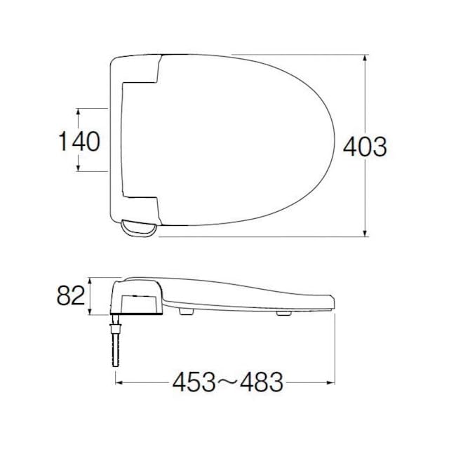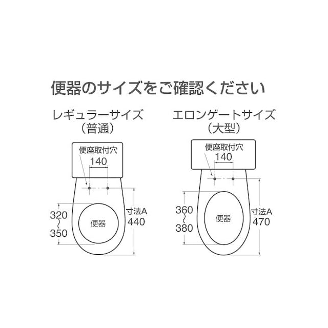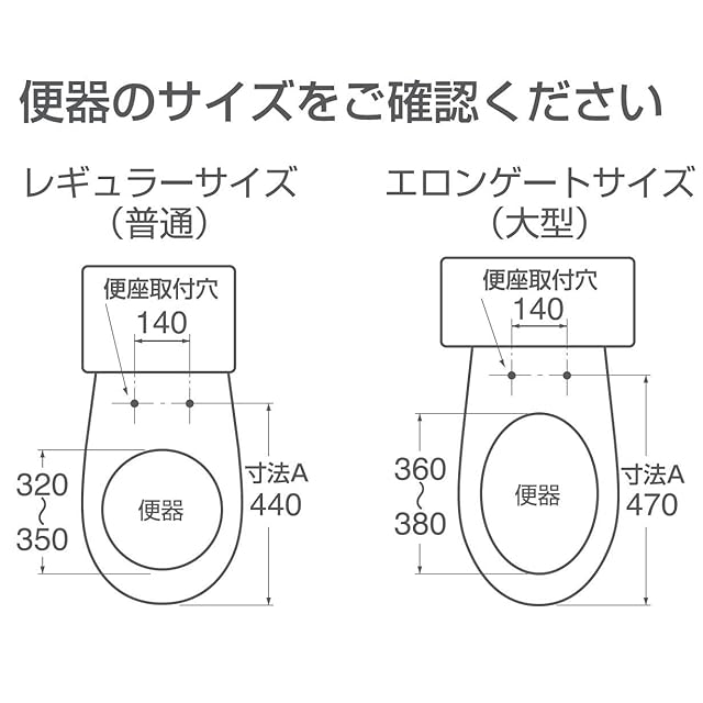 レギュラーサイズ(普通)【便座取付穴から便器の先端までのサイズ:440mm】または、エロンゲートサイズ(大型)【便座取付穴~便器先端までのサイズ:470mm】に取付可能。