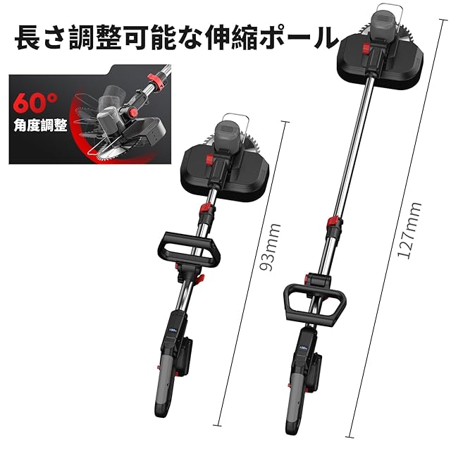 ハンドルは93cm~127cmまでスムーズに伸縮可能で、身長に合わせて最適な長さに調整可能。さらに、ヘッド部分は60度角度調整が可能なため、斜面や塀際など、通常の草刈り機では難しい場所も簡単に作業できます。