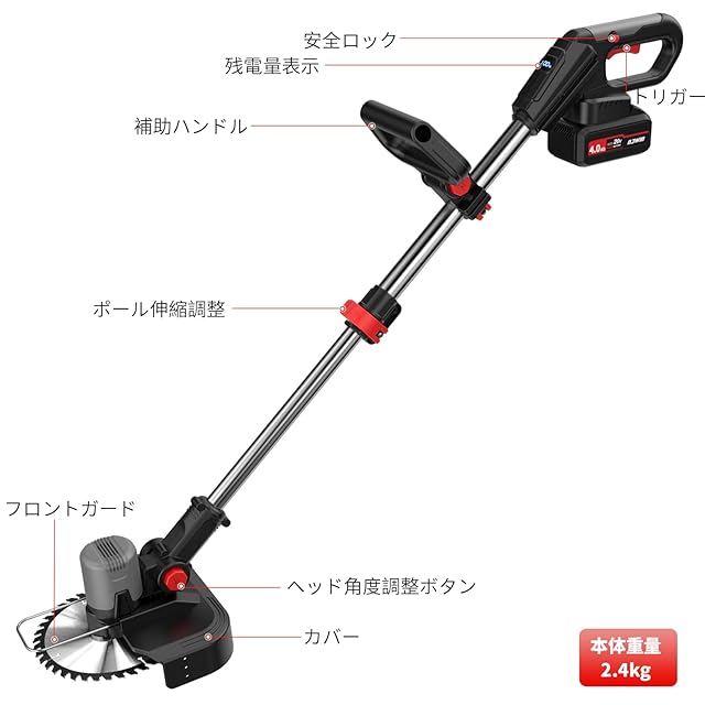 最新4.0Ahリチウムイオンバッテリーとブラシレスモーターを搭載し、最大80分の連続稼働を実現。広い庭や畑でも充電切れの心配なく、効率的に作業可能。エンジン式と違い、即時始動で面倒な準備は不要です。本体重量はわずか2.4kgと超軽量設計。長時間の作業でも疲れにくく、女性や高齢者でも楽に操作可能。