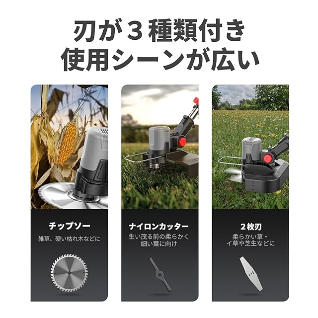 パケージ一覧:9インチ草刈り機、4.0Ah大容量バッテリー×2、急速充電器、補助ハンドル、ナイロンブレード×5、スチールブレード×2、チップソー×1(7インチ)