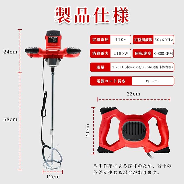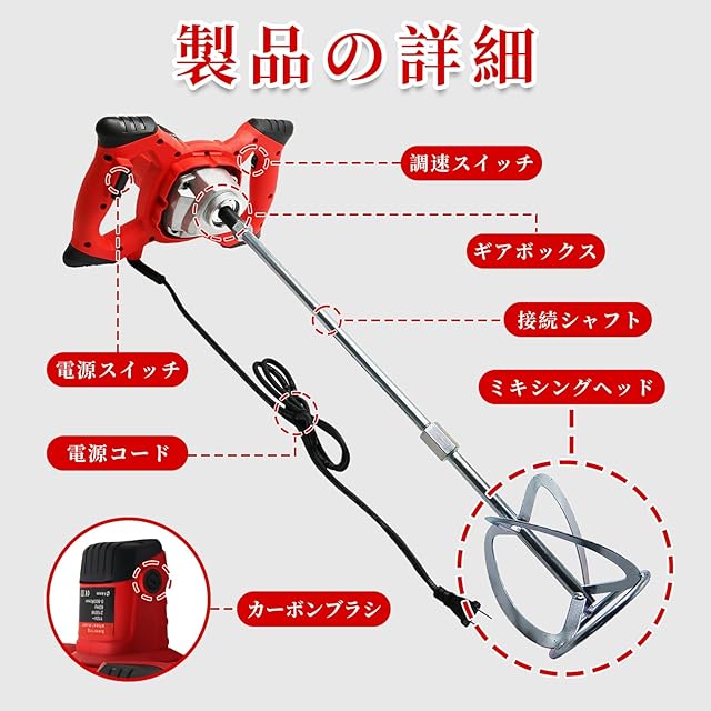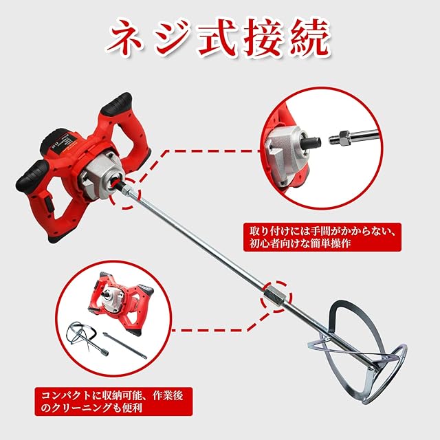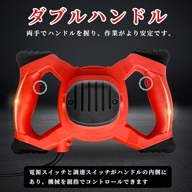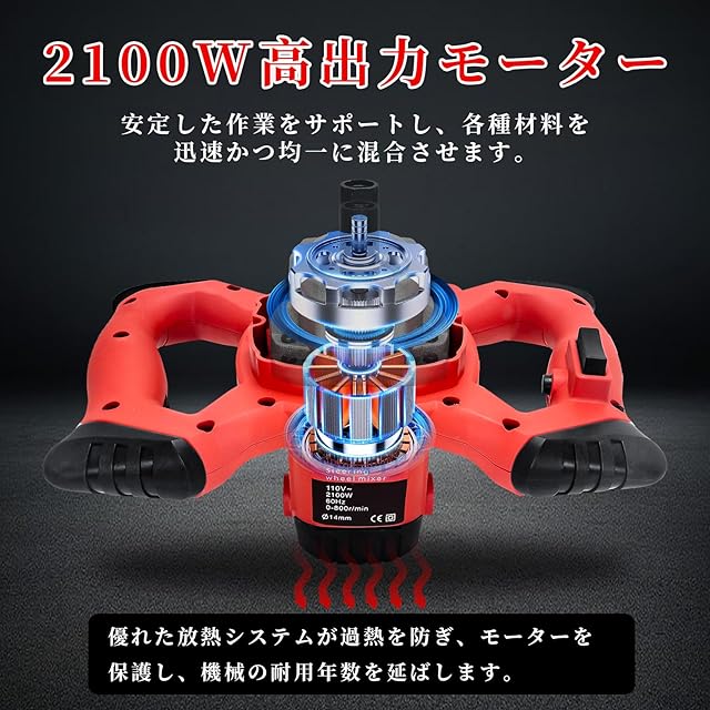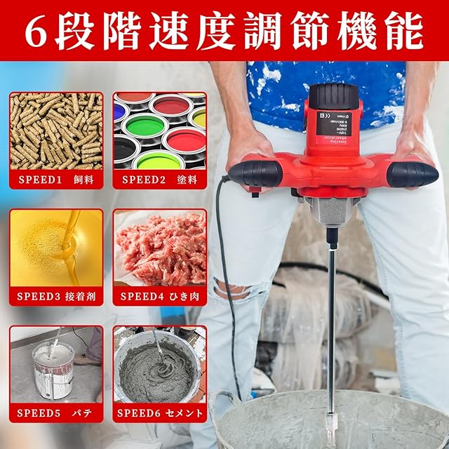 Howhite 攪拌機 かくはん コンクリート ミキサー 電気セメントミキサー 6速調整可能 2100W モルタル攪拌機 取り付け簡単 ペイントミキサー 溶液・塗料・ペンキ・モルタル・セメント カクハン 家庭用 業務用 DIY 攪拌ツール 初心者向け (赤い色)