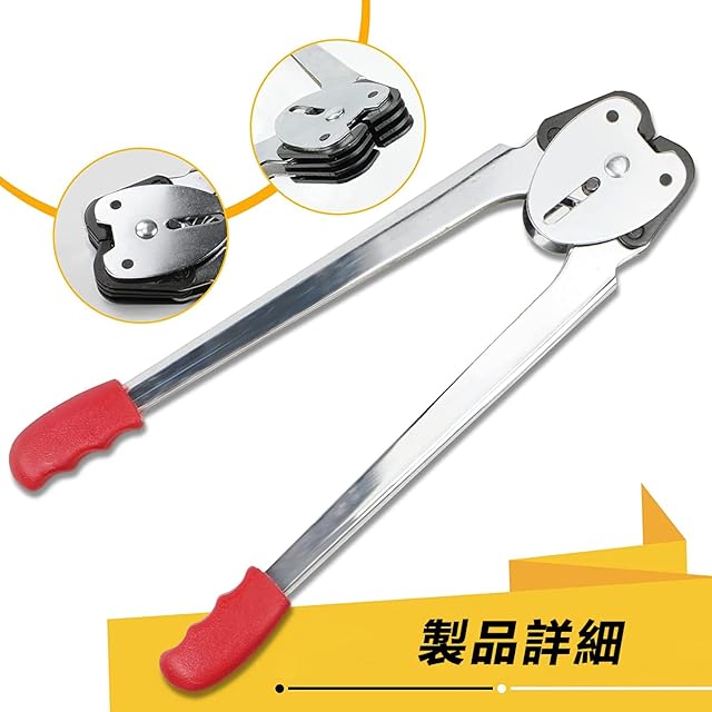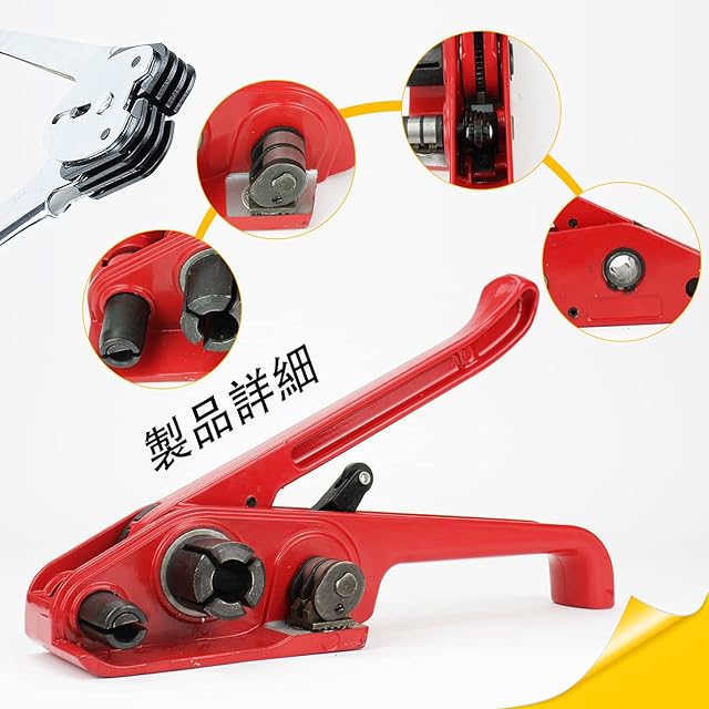 【商品内容】1x引締機、バンド幅13~19mm。1x封緘器、バンド幅16~19mm。適合バンド厚み:0.4-1.2mm。1Xロール13mm x 100mハンドストラップ。100個シール。100個エッジプロテクター。