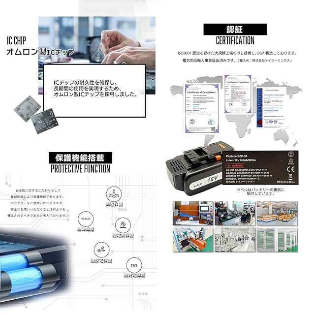 ✔型番:EZ9L54 ✔電圧:18V ✔容量:5000mAh ✔種類:リチウムイオン電池✔認証:PSE・CEマーク取得済