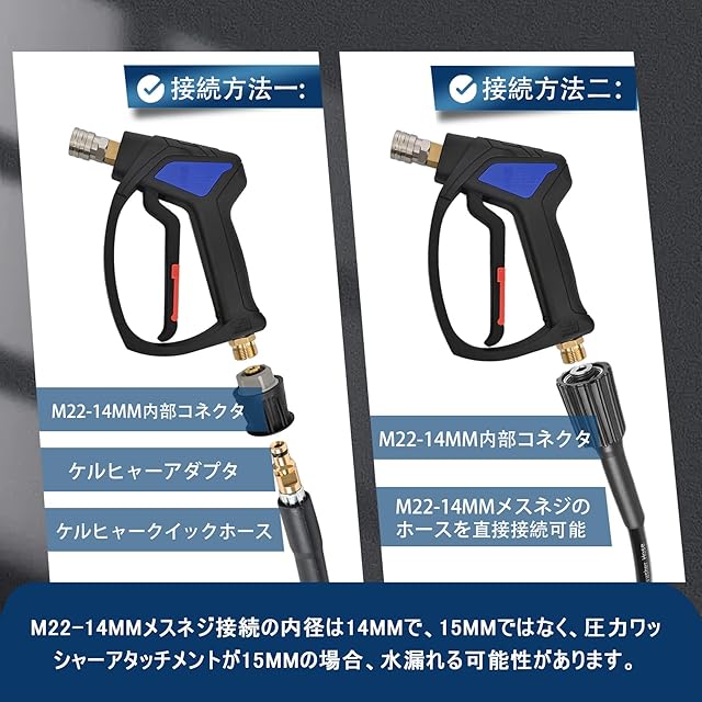 ケルヒャーショートガンテール部のサイズがM22-14MMであれば、従来通り幅広いケルヒャー高圧洗浄機に対応します。M22-14mmめねじジョイントのホースに直接接続できます。