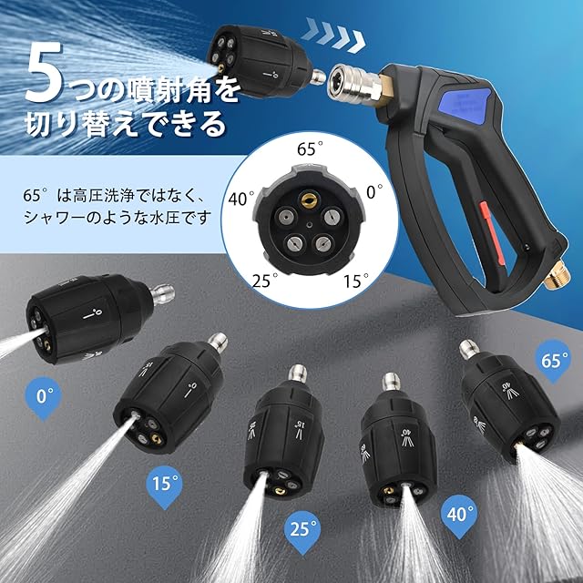 洗車ショートガンには、5in1(0〜65角度)調整可能な1/4インチクイックコネクトノズルチップが付属しています。ワンタッチで取り付け、取り外しも簡単です。さまざまなニーズを満たすために、5つのスプレーモードで、使用シナリオに応じて0°、15°、25°、40°、65°合理的にノズルチップを選択できます。