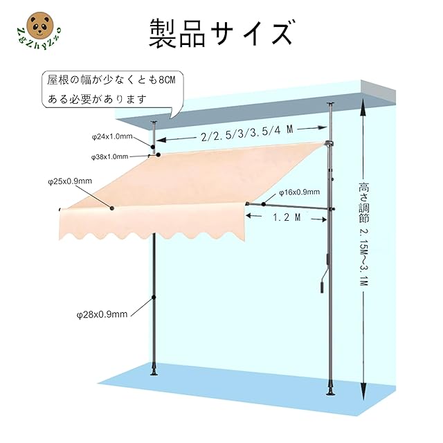 サイズ:全長200/250/300/350cm x 深さ120cm(幅×奥行)。伸縮棒の長さは215-310cm。 注意:設置高度は215cm以上でなければなりません。