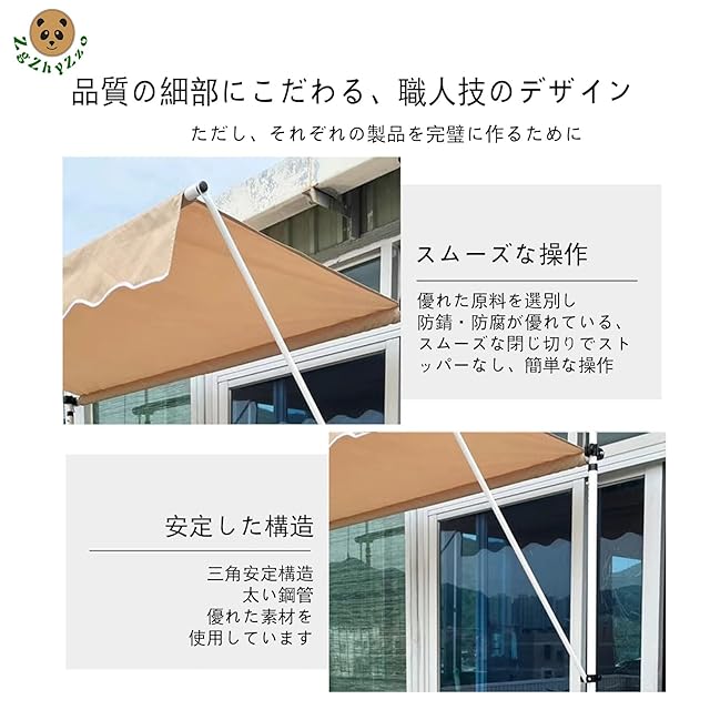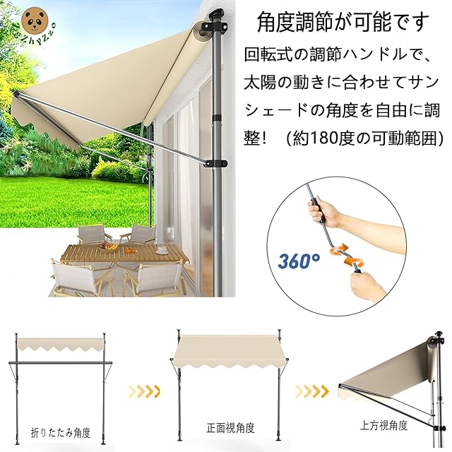 [簡単設置・穴あけ不要] 当社のサンシェードは取り付けが簡単で、ドリル作業が不要です。手回し式ハンドルで簡単に高さを調節可能(調節範囲215cm~315cm)。取扱説明書に沿って簡単に組み立てられるため、壁や床を傷つける心配がありません。穴を開ける必要がないので、必要に応じて日よけの設置場所を自由に変更できます。