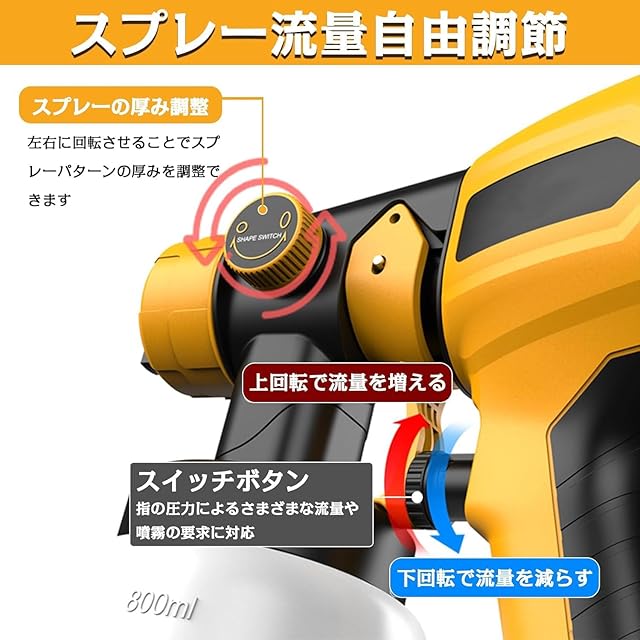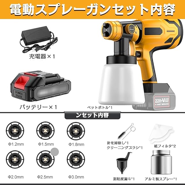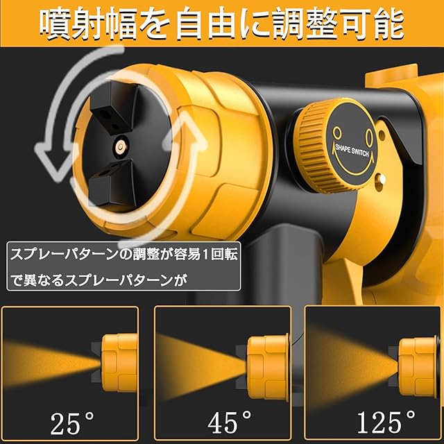 【6種類のノズル・調整可能な流量】 6種類の口径のノズル(1.2mm、1.5mm、1.8mm、2.0mm、2.5mm、3.0mm)を搭載し、すばやく交換し、さまざまな濃度の塗料を吹き付けられる。吹き付け項目ごとに最適なノズルを選ぶことができ、手間がかからない。噴射量はトリガーによって無段階調整可能、ハンドルにあるダイヤルを回せばトリガーの動作を制限し、上限値をコントロールできます。大きく塗りたい場合は、右に回転させてください。小さく塗りたい場合は左に回してください。霧状の超微粒子の塗料を噴出し、凹凸面にかかわらず塗料を均一に被覆できるため、車両、室内壁、家具、フェンス、DIY工芸品などの塗装に適しています、完璧的に仕上がります。