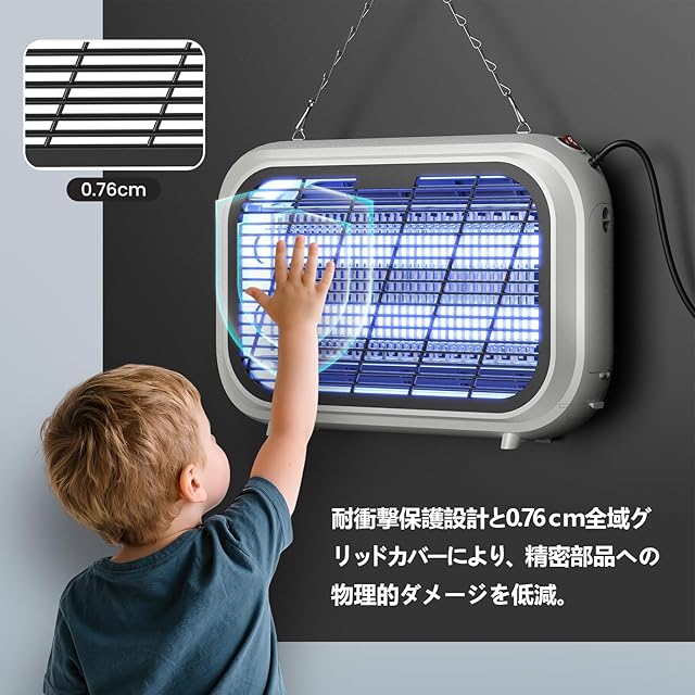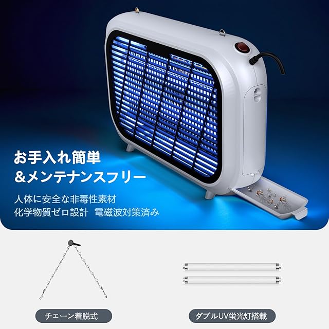 【簡単操作・安心安全】コンセントに挿してスイッチを押すだけの簡単操作。スプレーの飛散や薬剤の嫌な臭いもなく、人体に無害な電撃式で安心。煙も出さず、空気をクリーンに保ちながら瞬時に虫を駆除できます。小さなお子様やペットのいるご家庭でも安心して使用可能。12ヶ月のメーカー保証付きで、不具合があればいつでもご連絡ください。丁寧に対応いたします。付属品:吊り下げ用チェーン、ブラシ。