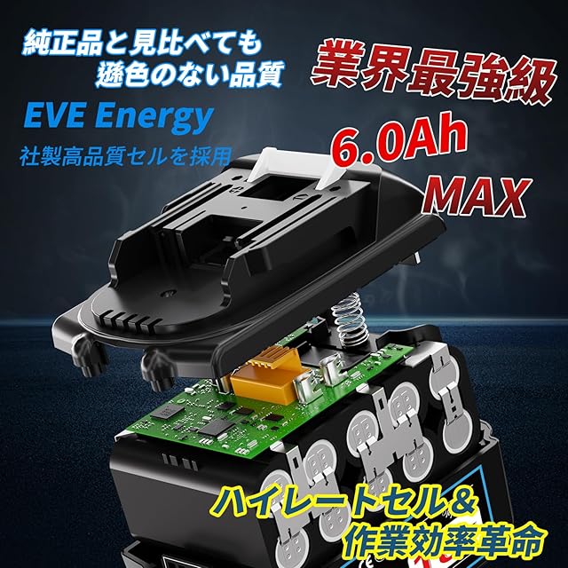 ⚡【EVE社製セル&800回長寿命】 マキタ バッテリー 18v互換モデルにEVE Energy社製高品質セルを採用。800回充電後も90%容量維持の耐久性を実証。難燃性強化ケースとメモリーフリー設計で、継ぎ足し充電可能。自然放電率0.5%/月以下を実現し、常に即戦力状態をキープします。