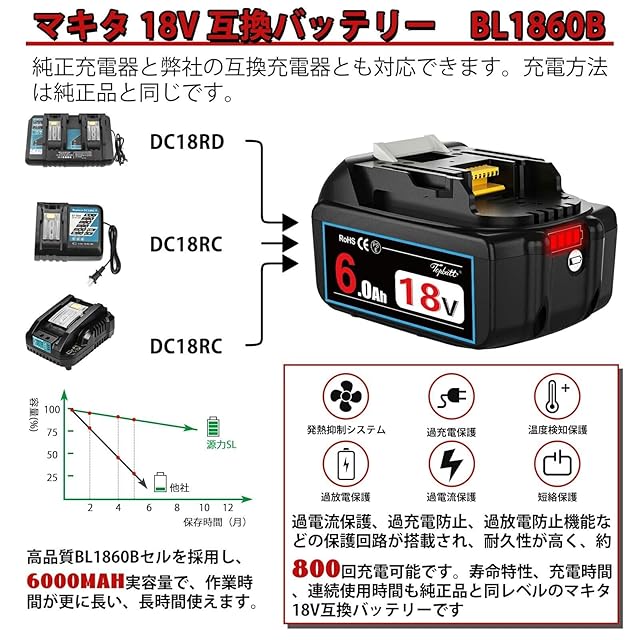 【BL1860B対応可能】急速充電器DC18RFにも対応!!! 互換マキタ 18v バッテリー互換可能バッテリー: BL1815N BL1830B BL1860B 194205-3 194230-4 LXT400などに互換可能です。 互換マキタ 充電器DC18RA、DC18RC、DC18RD、DC18RF、DC18REなどに対応できます。 互換マキタ18v+36v 電動工具に適用出来ます。インパクトドライバー インパクトレンチ 丸鋸 草刈機 掃除機、チェーンソー、集塵機、ブロアー、空気入れなどの機種に対応し、 純正バッテリーと同様に準ずます。