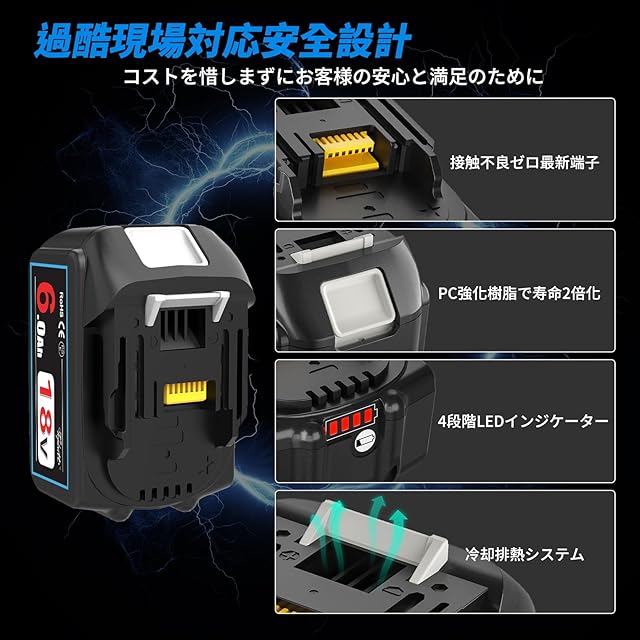 【完全実容量6.0Ah&PSE/CE認証済】 マキタ 18v バッテリーBL1860B完全互換設計、実容量6000mAh(6.0Ah)を実現。純正品同等の18V安定出力を維持しつつ、草刈機/チェーンソーなどの電動工具用高耐久設計。PSE・CE認証を取得した高品質リチウムイオンバッテリーを4個セットで提供。過酷な作業環境でも電圧低下を抑えた安定動作を実現します。