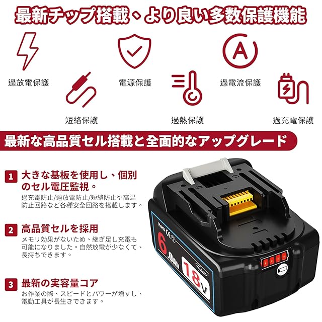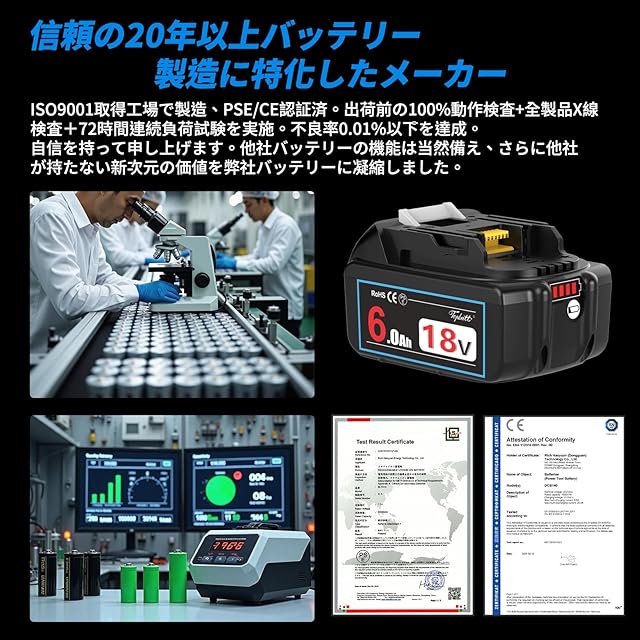 【電動工具用高耐久保障】 ISO9001認証工場で生産した信頼性。全製品1年間の品質保障付き。専門店ならではの工具用バッテリー設計ノウハウを結集。PSE認証取得済の安全性と完全実容量6000mAhを両立。工具プロユースを想定した防塵・耐衝撃構造を採用しています。