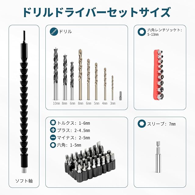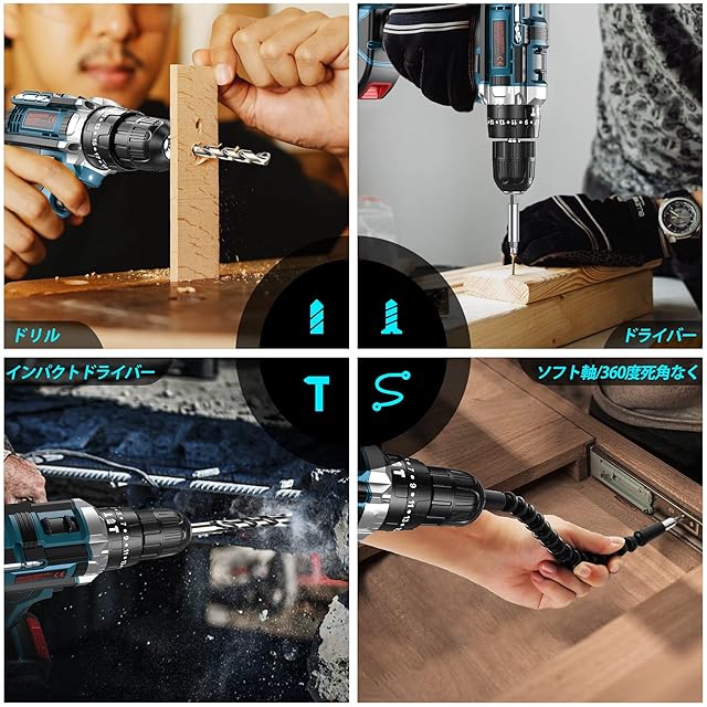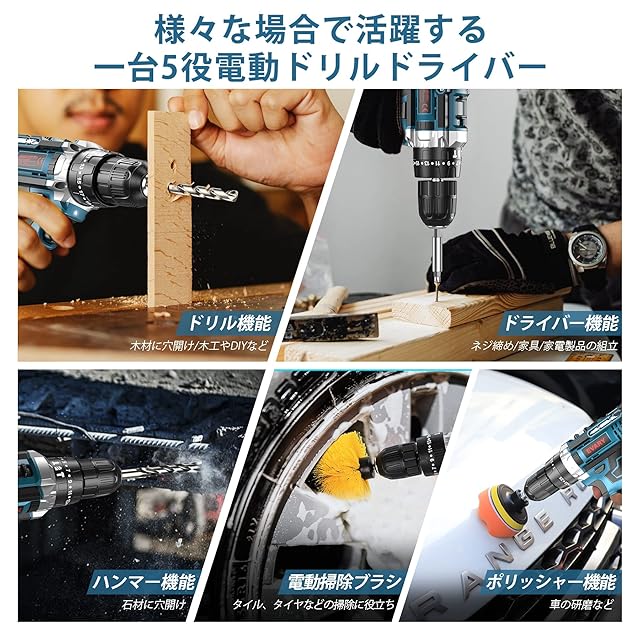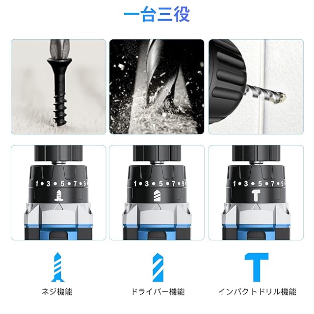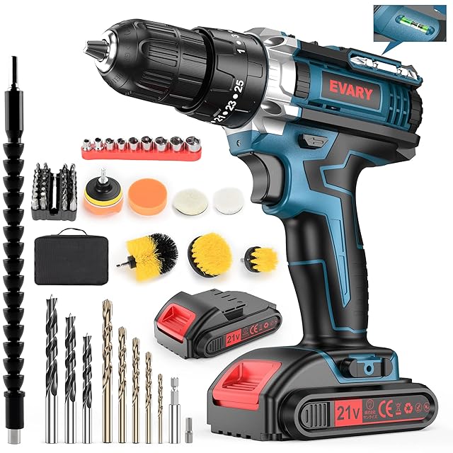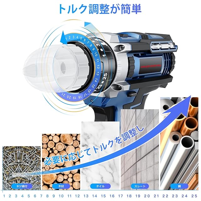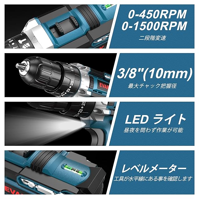 EVARY 電動ドライバー 21V 2000mAhバッテリー2個付き 最大42N・m 25+3段階トルク調節 電動ドリル 一台5役 無断変速 正逆転切替 コードレス ドリルドライバー 、LEDライト ネジ締付工具 穴あけ DIY家具組み立て適切 初心者でも使いやすい(ブルー)