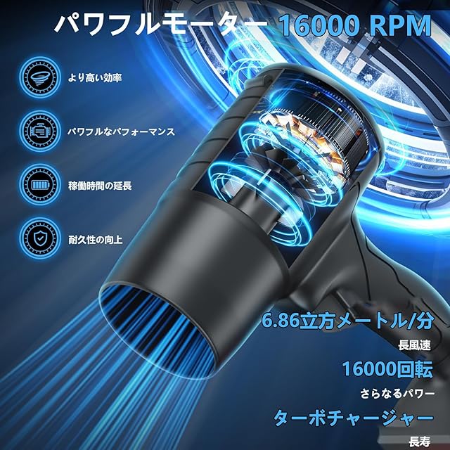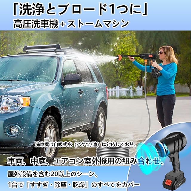 【6合1ノズル+専用ドライヤー|洗浄から乾燥まで完全サポート!】 6合1ノズル(0°・15°・25°・40°・ジェットブラシ・微調整モード)で多様な洗浄シーンに対応。専用ドライヤー(300W/風量6.86m³/min/最大16000回転)付属で、洗浄後の車体やアウトドアギアを素早く乾燥。水垢や水滴痕を防止し、洗車機とドライヤーのダブル機能でプロ並みの仕上がりを実現