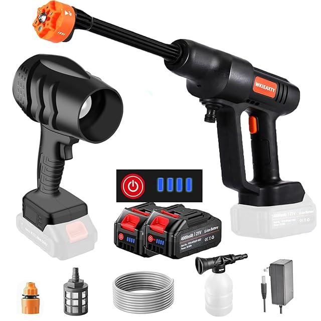 【ヘアドライヤーと洗車機|軽量&高出力でプロ級の洗浄力!】 高圧洗浄機・強力ブロワー・大容量バッテリー2個・充電器・6-in-1ノズル・フォームノズル・泡ボトル・5m給水ホース・フィルター・収納ケースが全て付属。初めての方でも安心できる平易な日本語の説明書付き。IPX5防水機能(充電式高圧洗浄機)と防塵フィルター(強力ブロワー)を搭載し、雨天や砂埃の多い環境でも安心。コンパクト収納でガレージや物置のスペースを節約します