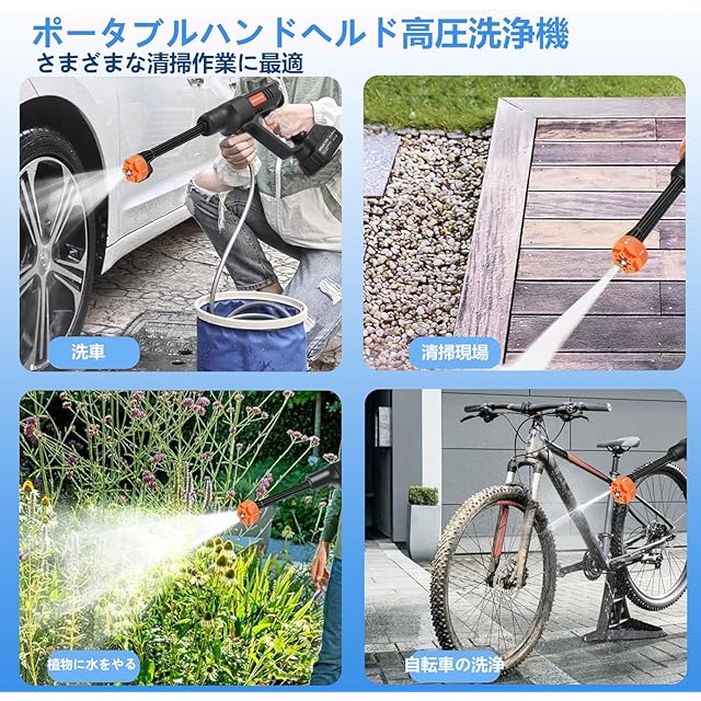 高圧洗浄機 コードレス充電式(マキタ互換対応)20000mAh・バッテリー残量表示機能付き 噴霧距離10m/噴霧水量10L/min 6-in-1ノズル&ブロワー搭載。本体重量0.7kgの軽量ポータブル設計で、持ち運びも容易です。洗車、庭掃除、階段清掃、バルコニー・ポーチケアなど、アウトドア用途から家庭用まで幅広く活用可能