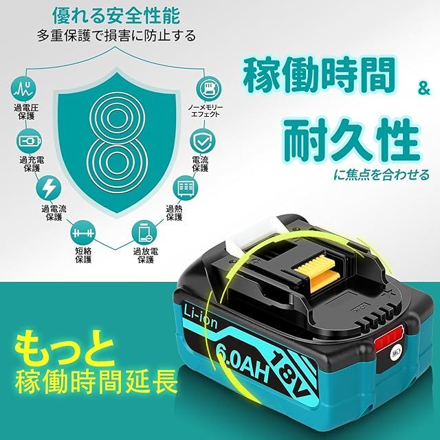 【仕様】 BL1860 マキタ用18V互換バッテリー 2個セット 容量:6.0Ah(6000mAh) 重さ:610g 種類:交換用リチウムイオンバッテリー