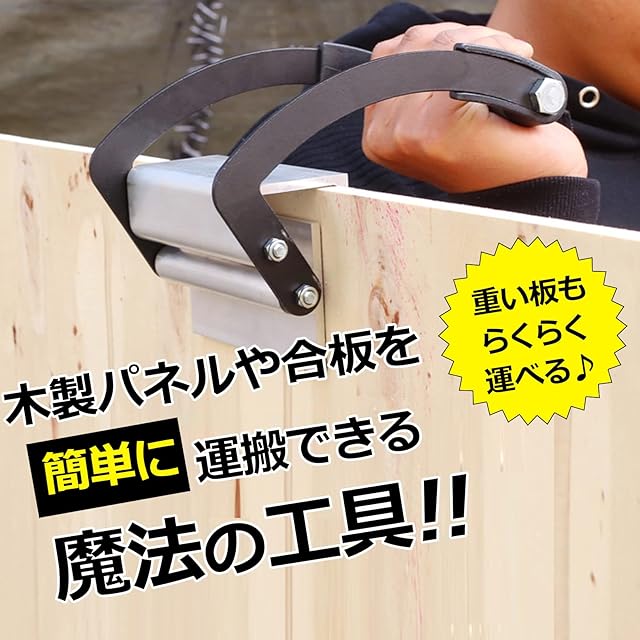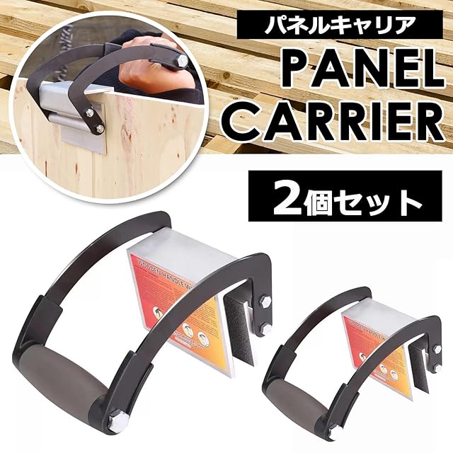 パネルキャリアは、木製パネル、合板を簡単に運搬できる魔法の工具。強力なグリップ力のリフターに板材を挟んでスポンジのついたハンドルを持ち上げれば大きく重い板材を簡単に運搬できる優れもの。単品、2個セット。