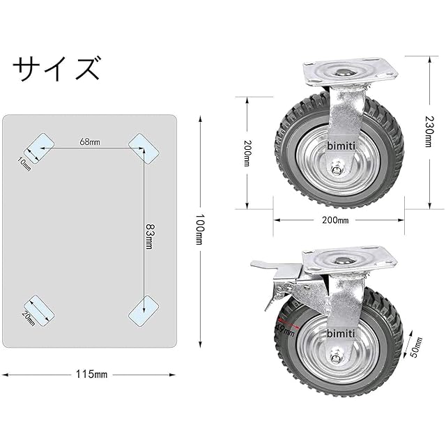 製品パラメータ:車輪径:200 mm 車輪幅:50 mm 取付高:230 mm 許容荷重:約390 kg(ブレーキなし2 個、ブレーキ付き2 個)