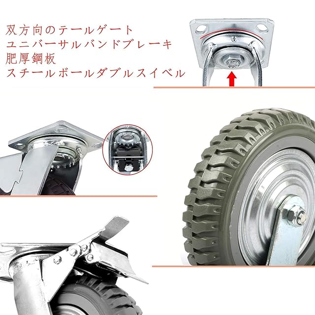 幅広い用途:ワークショップ、産業、倉庫、台車、医療機器などで広く使用されています。1輪の耐荷重は200 kg、4 輪の耐荷重は約1000 kgです