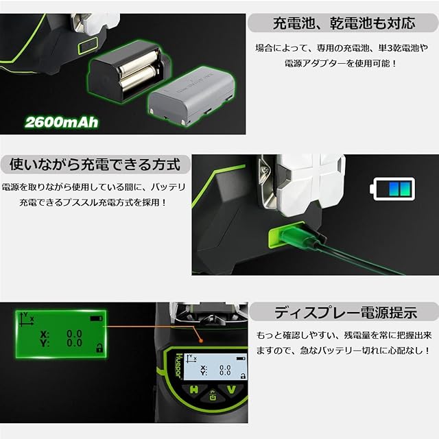 【3電源方式、急な電源切れに心配なし】3電源方式で、短時間や急に墨出し器を使用したい場合は専用の充電池や単3電池を使用し、長時間の作業では電源アダプターを接続して使用することができます。また電源を取りながら使用している間に、バッテリ 充電できるプススル充電方式を採用!