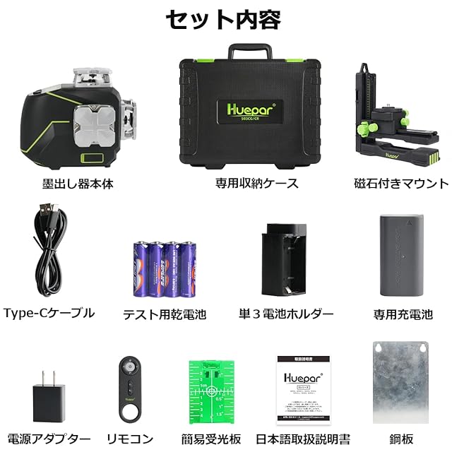 Huepar レーザー墨出し器 グリーンレーザー フルライン 3x360° 角度表示 LCDディスプレー エレベーターマウント リモコン付き 3電源方式 S03CG