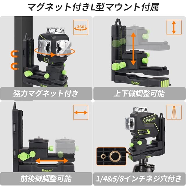 【多機能L型エレベーターマウント付属】付属のL型軽天マウントは上下微調整可能で、作業中の位置合わせに対応できます。またエレベーターマウントの背面には強力マグネット付きで、鋼材にマグネットでつけて使用でき、三脚の届かない高所での作業も効率良くできます。