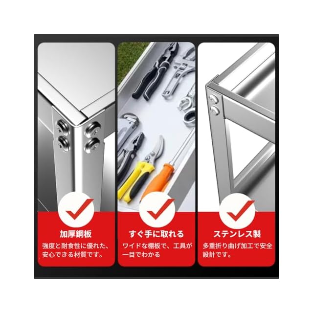 200KGの強力な耐荷重 -- 厚みのある支柱と多重折り曲げ加工により、優れた耐久性と安定性を実現。さらに、手を傷つけにくい設計が施されており、安全に使用できます。サイズは幅67×奥行37×高さ75CMで、さまざまな作業環境に適しています。