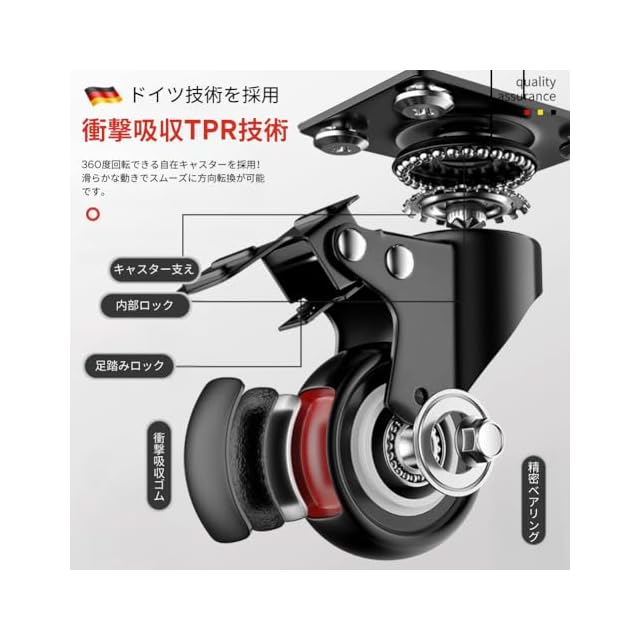 静音キャスター -- 操作性は重要なポイントであるため、このツールカートには静音キャスターを搭載。高品質なキャスターにより、移動時の騒音を最小限に抑え、静かでスムーズな移動を実現します。満載時でも安定した動きを保ち、狭いスペースや凹凸のある床でもスムーズに走行できる優れた機動性を備えています。