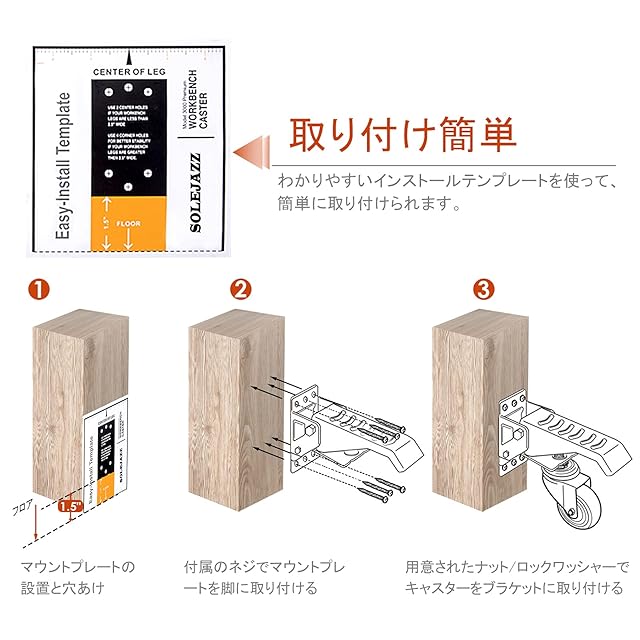 【組立簡単】ベース面に迅速、平穏に取り付けることができるために、4つのキャスターを除いて、本製品は必要な取り付け金具、組立説明書とインストールテンプレートが付属しています。