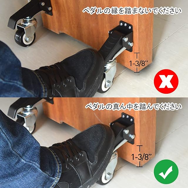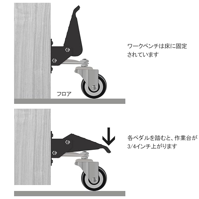 【利用便利】全てのリフトペダルにはリブとテクスチャーが付いて、足に力が加わったときのグリップ力を高めています。ペダルを押し下げるだけで、作業台を床から浮かせることができます。