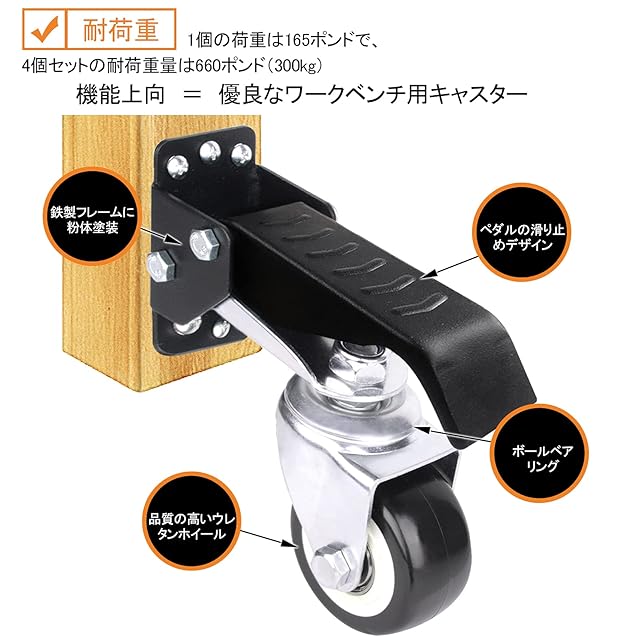 【超耐久 高品質】頑丈な鋼製キャスターで、300kgまでの重いワークベンチを移動可能式に魔法のように変えます!板の上部も下部にも3つの穴があって、超長時間で使えるホイールとベアリングを取り入れます。