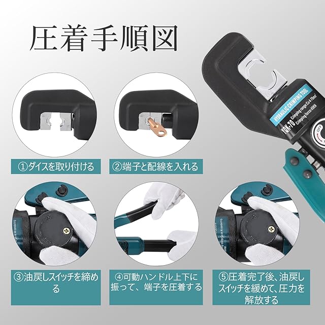 「適用範囲」:4~50mm²のアルミ端子と6~70mm²の銅端子の圧着に最適です。丸型のワイヤースリーブや太線のカシメも使用できます。