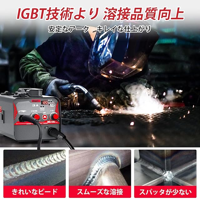 【最先端IGBTインバーター】最先端なIGBTインバータ制御を採用し、出力電流がスムーズに制御され、低電流でも高電流でもアークが安定になり、スパッタも少なくて、キレイな仕上がりが得られ、溶接品質が向上!それに、インバータ制御技術により、従来品に比べ、軽量化と出力・使用率の大幅アップを実現しました。
