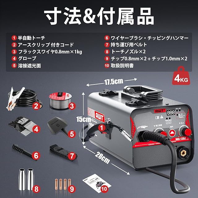 【120AノンガスMIG溶接機】電圧:AC100V±15% 周波数:50Hz/60Hz 定格出力電流:120A 適用ワイヤー:φ0.8MM/φ1.0MM 溶接可能板厚:0.5-3.0mm【付属品】日本語取扱説明書、アースクリップ付きコード、ワイヤーブラシ付きハンマー、軟鋼用フラックスワイヤーφ0.8mm×1kg、チップ0.8mm*2+1.0mm*2、トーチノズル*2、ショルダーベルト、グローブ、溶接遮光面