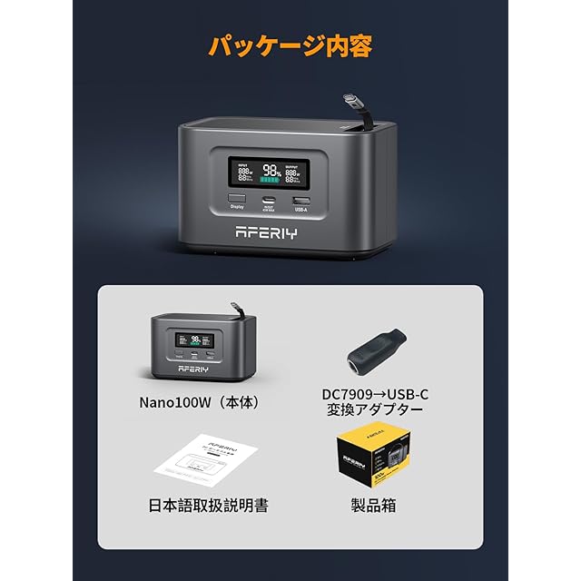 【手のひらサイズ&USB-C 100W双方向高速充電対応】 AFERIY Nano 100は、コンパクトなポータブル電源で、2つのUSB-Cポートを使用し、最大出力145Wを実現します。付属のケーブルでは、100Wの入出力が可能です。USB-Cポート×2、USB-Aポート×1を備え、スマホやタブレット、ノートPCなど複数機器を同時に充電可能。約1.5時間でフル充電が完了し、ビジネスや旅行、アウトドアに最適。※AC出力非対応。