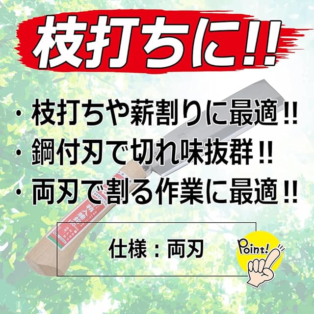 特徴:切れ味抜群の鋼付刃で枝打ち・薪割りが楽々できる